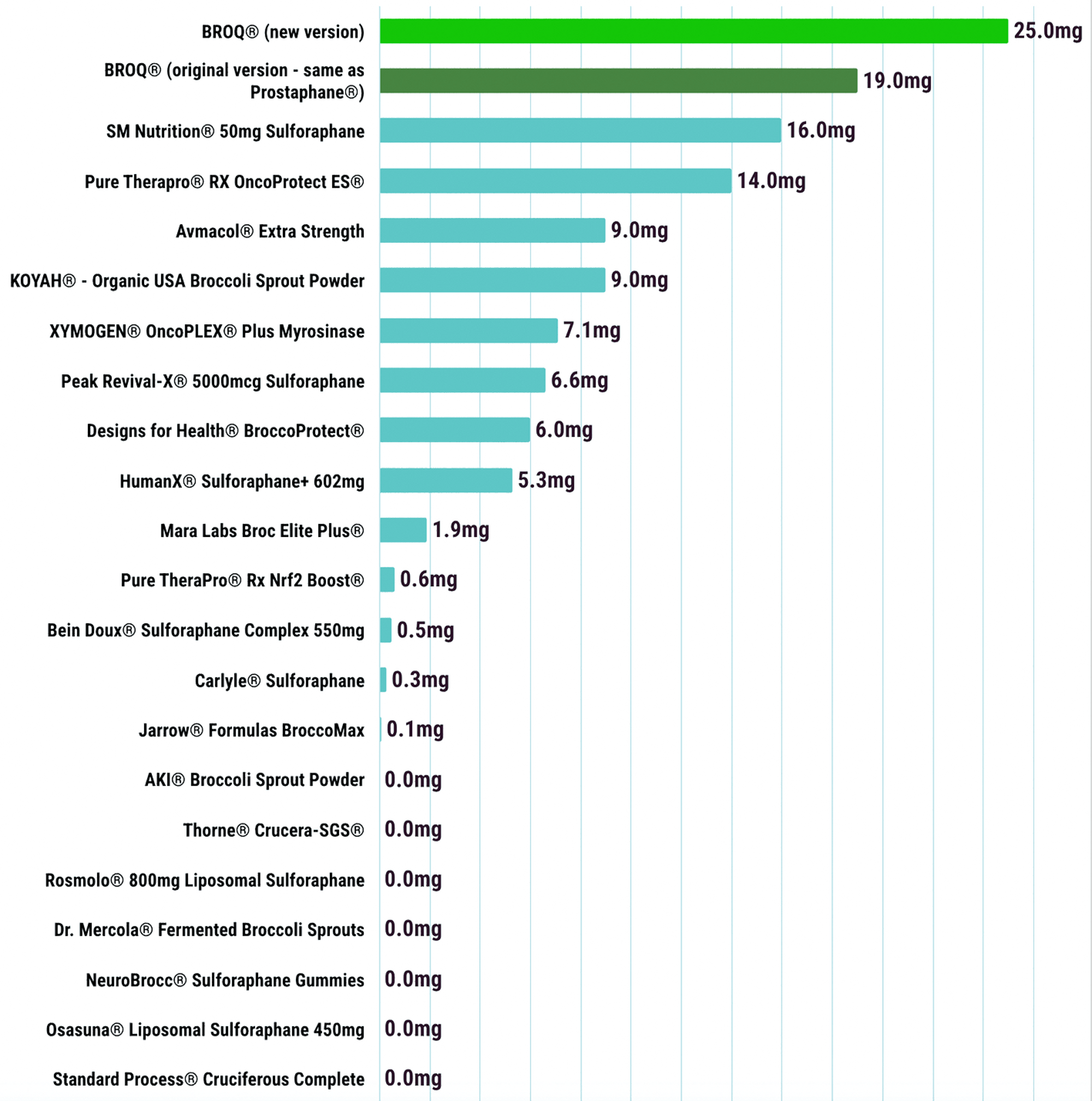 The numbers shown are the amount of sulforaphane yielded from a single serving. Scroll down to read more about what you see here, including an explanation of the ranges displayed for six of the products.