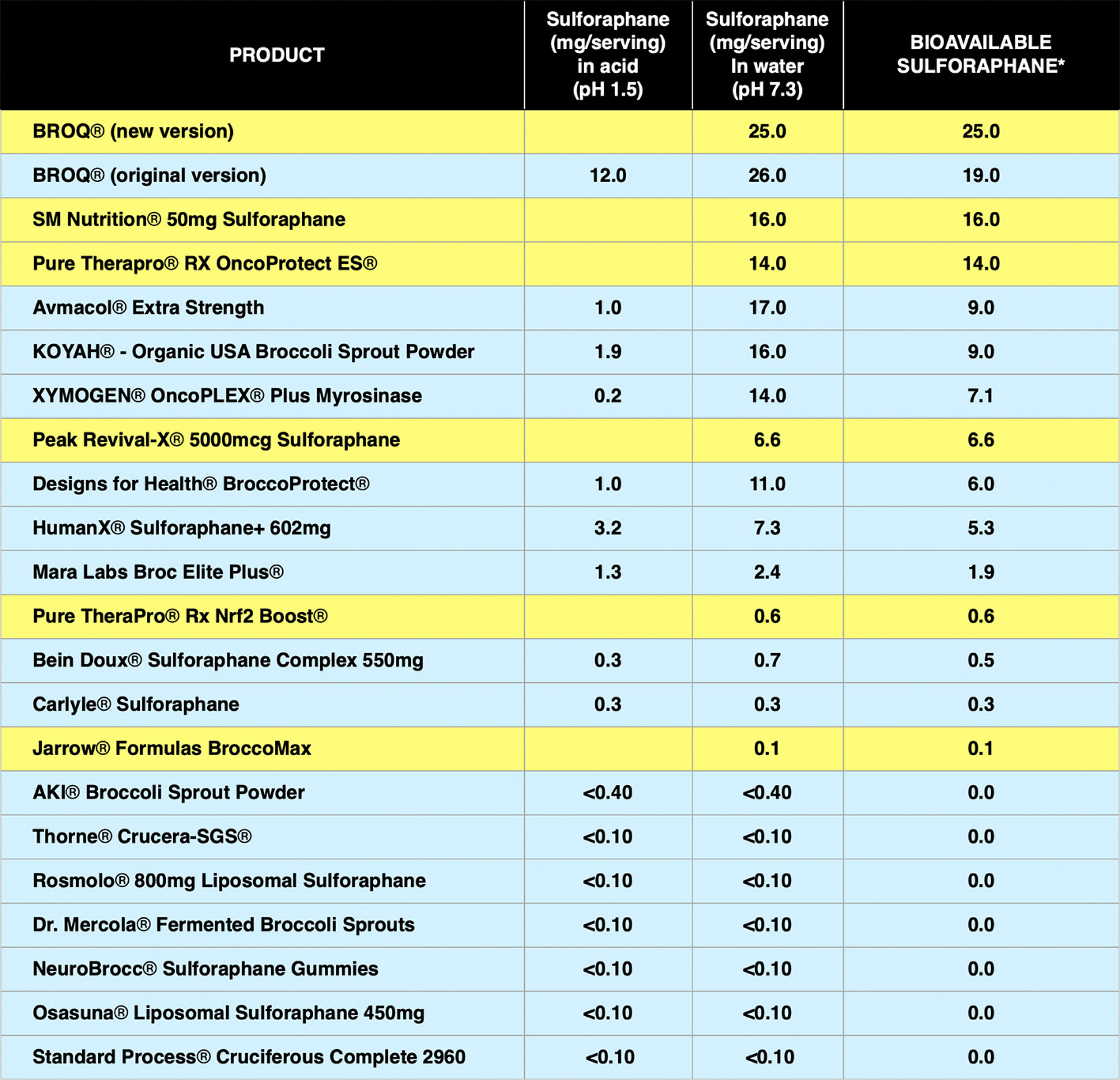 * — Yellow shading indicates delayed-release products. For these, “Bioavailable Sulforaphane” is the test result in water (as this is the pH of the intestines, where these products are absorbed). Blue shading indicates immediate-release products. For these, “Bioavailable Sulforaphane” is the average of the test result in water and the test result in acid. Download the full PDF of 3rd-party lab results here.