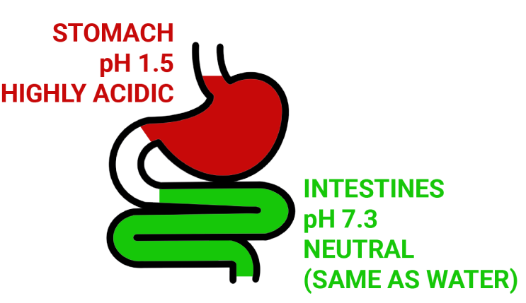 Immediate-release products are absorbed in the stomach, which is highly acidic (pH 1.5).