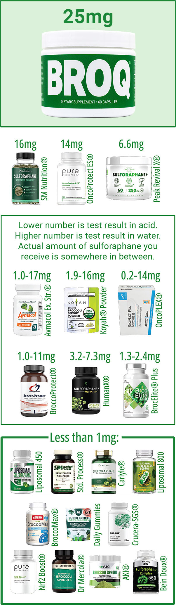 The actual amount of sulforaphane you receive from the product will be somewhere in between the two results (depending on how quickly the myrosinase is eliminated by the acid).
