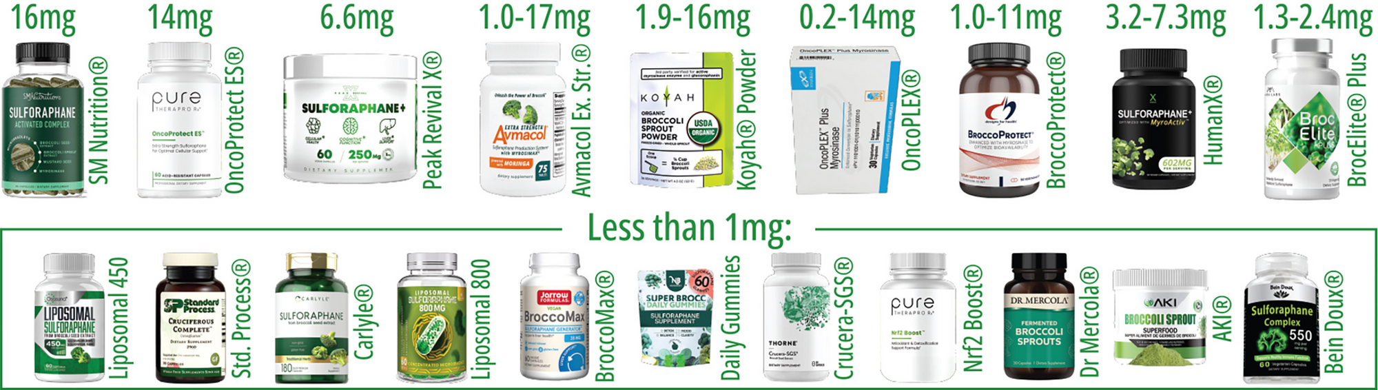 Below are the sulforaphane levels produced by all top-selling sulforaphane supplements in the U.S., as measured independently by IEH Laboratories.
