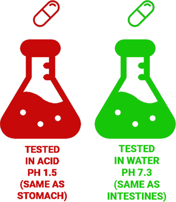 All products that use immediate-release capsules were tested in two different liquids: water (pH 7.3) and acid (pH 1.5).